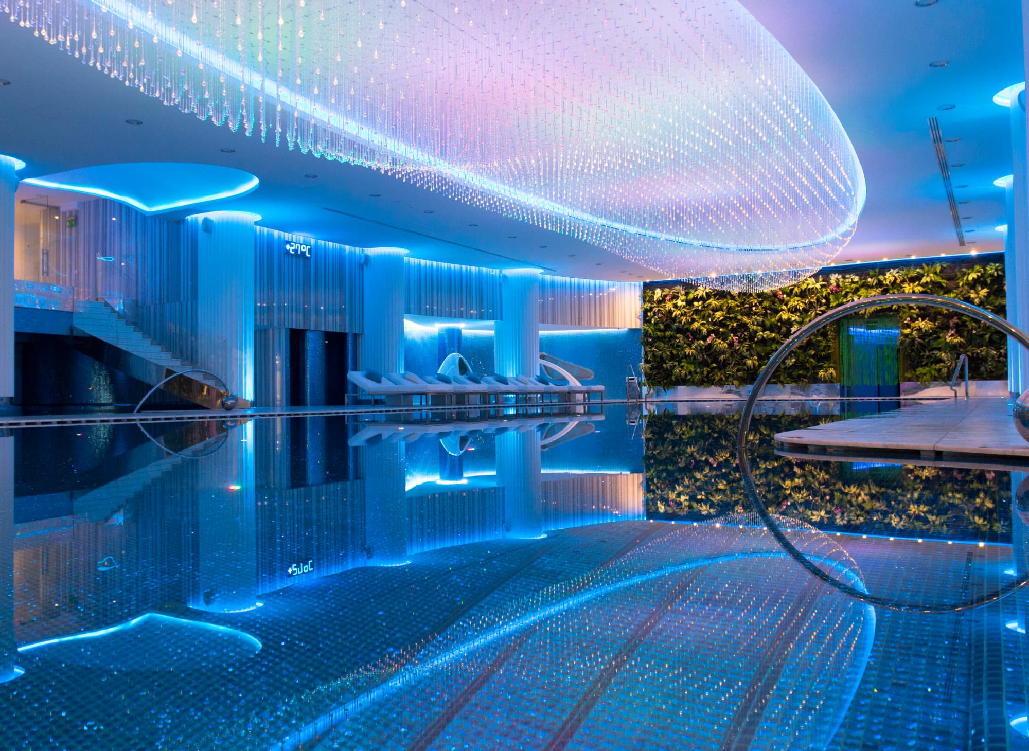 Деталі інтер’єру заворожують: стіна з підсвіткою з оніксу, підлога з благородного мармуру та гальки Bianco Carrara, двомісні шезлонги, центр зали прикрашає акваріум з океанічними рибками.