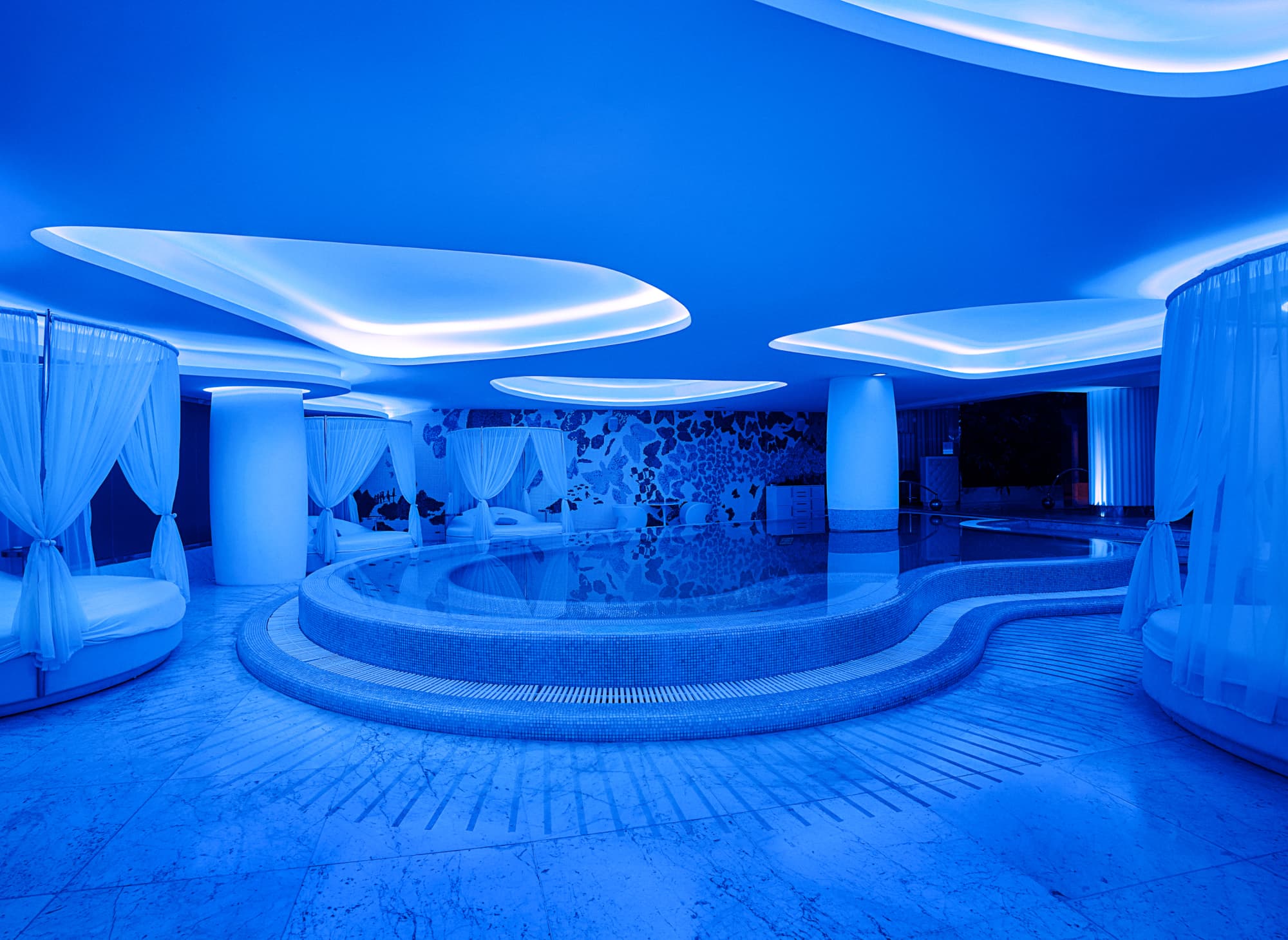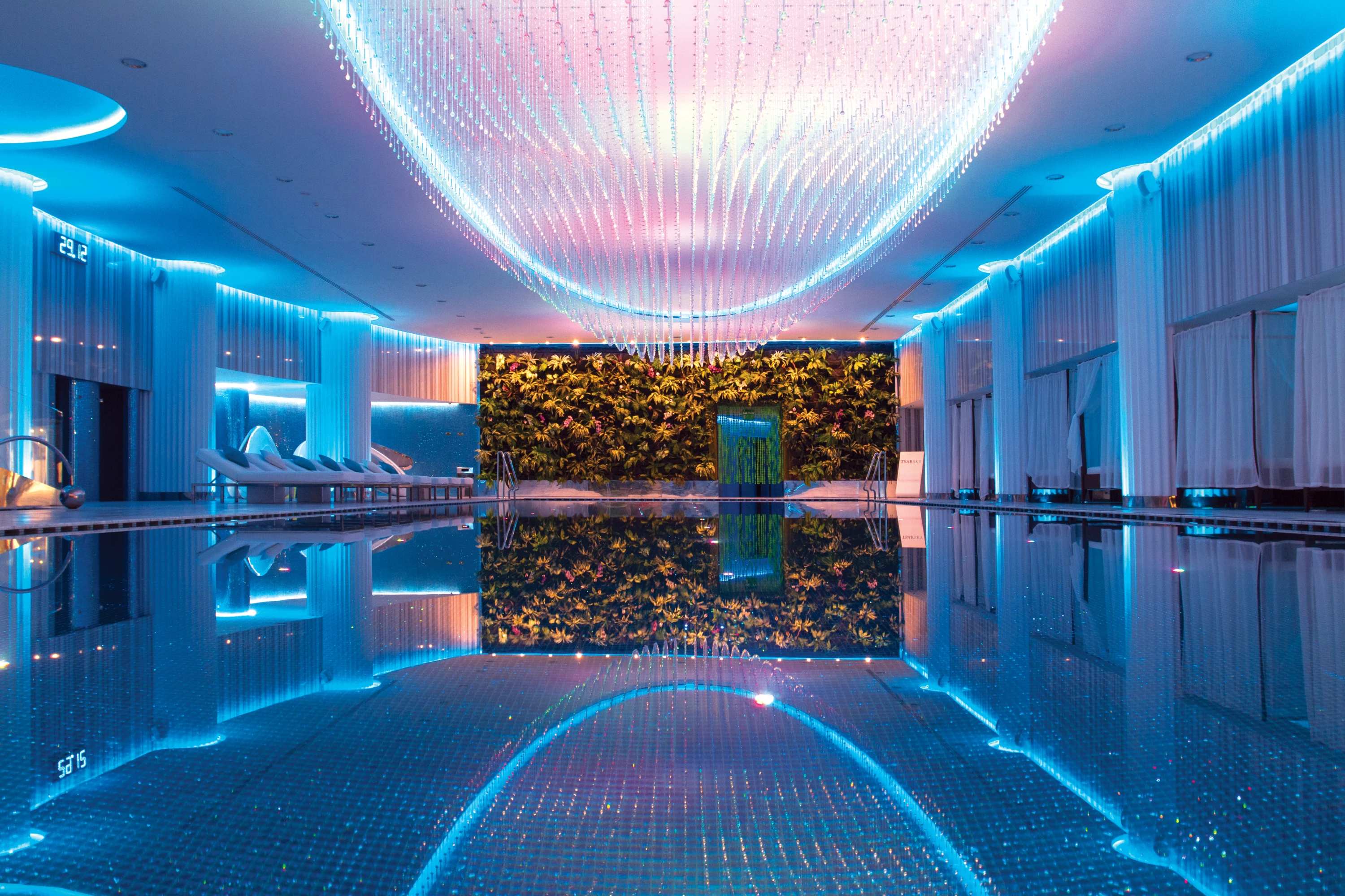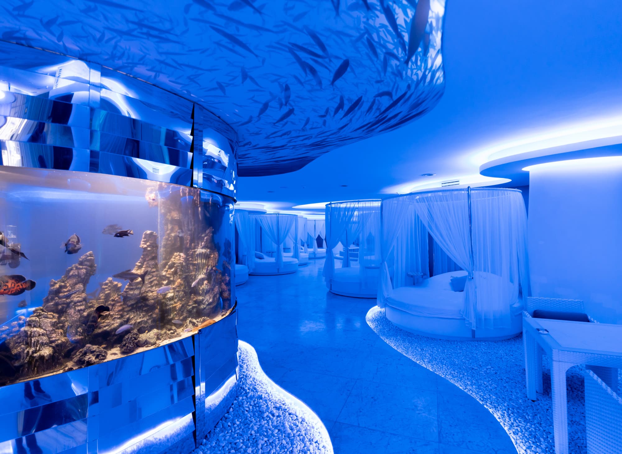 Деталі інтер’єру заворожують: стіна з підсвіткою з оніксу, підлога з благородного мармуру та гальки Bianco Carrara, двомісні шезлонги, центр зали прикрашає акваріум з океанічними рибками.